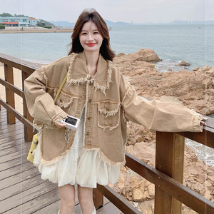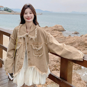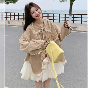 单排扣慵懒风网纱拼接牛仔短外套百搭新款潮流长袖气质休闲夹克潮