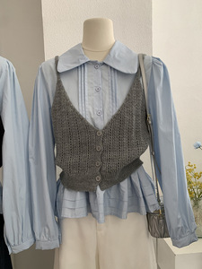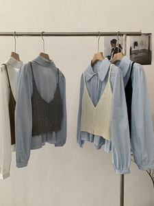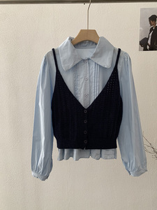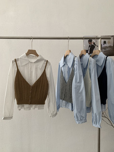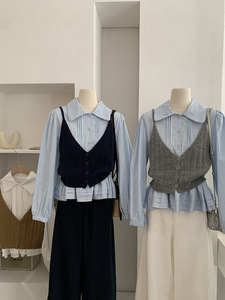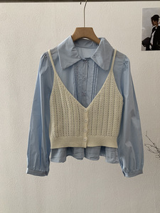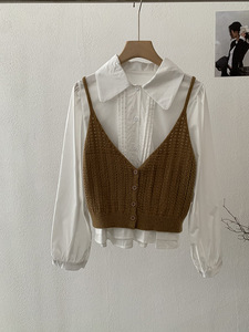 欧玛莱 学院风两件套翻领褶皱长袖衬衫+针织吊带背心叠穿上衣4643