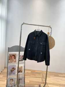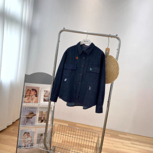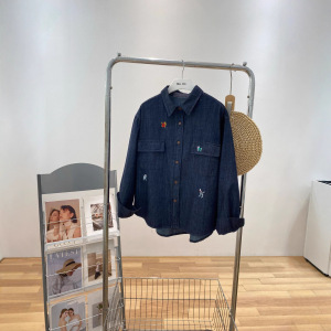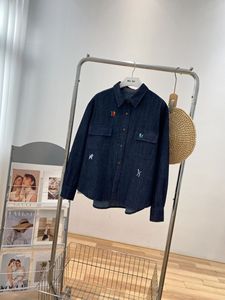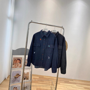 秋韩系简约深蓝色翻领卡通刺绣图案休闲宽松叠穿柔软牛仔女衬衫