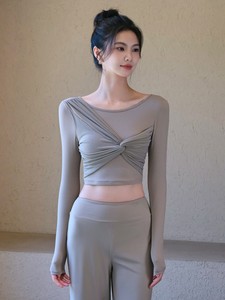 带胸垫瑜伽服舒适透气上衣女秋季新款网纱扭结运动长袖跑步健身