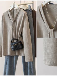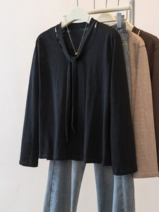 美拉德系带V领正肩长袖T恤打底衫女秋季大码胖mm遮肉显瘦内搭上衣
