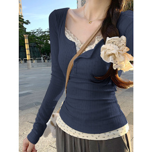 纯欲bm风蕾丝假两件长袖T恤女春秋法式感修身内搭甜辣妹上衣