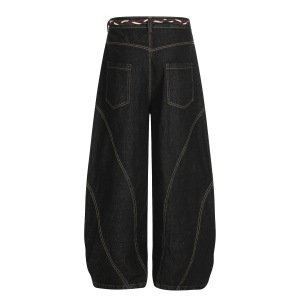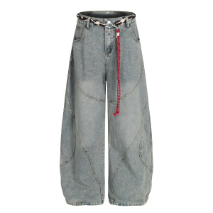 美式复古拼接腰链水洗弯刀牛仔裤男女同款宽松阔腿拖地裤2025年新