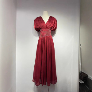 时尚名媛气质重工缎面镶钻收腰连衣裙女秋季新款V领高级感长裙