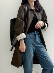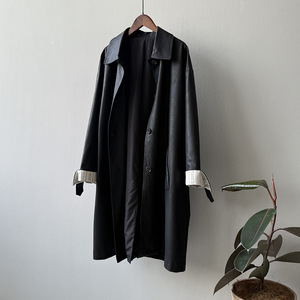 言双 简约竖条拼接卷边袖皮衣女 秋季设计感单排扣风衣大衣H9563