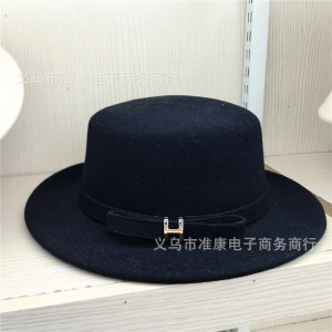 英伦风字母装饰平顶礼帽女冬季时尚羊毛毡帽复古百搭气质爵士帽潮