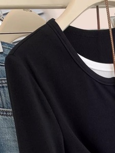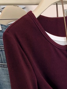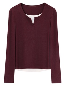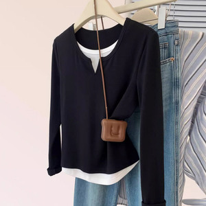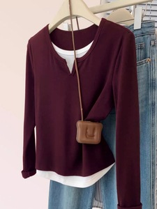 韩版假两件拼接内搭v领打底衫女2025春季新款安可拉红修身长袖t恤
