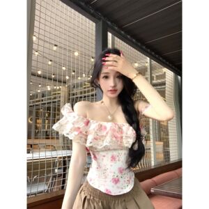 一字肩荷叶边短袖碎花衬衫女夏季蕾丝拼接修身衬衣温柔风收腰上衣