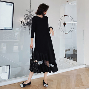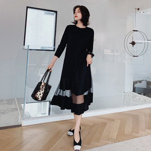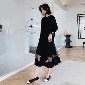 猫-6500#实拍现货 初秋薄款 宽松长款拼接网纱圆领裙摆长袖连衣裙