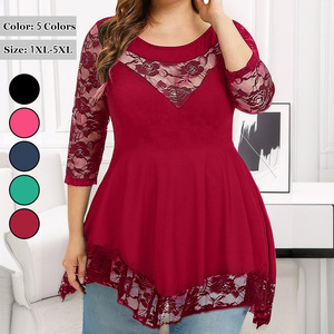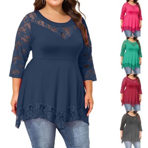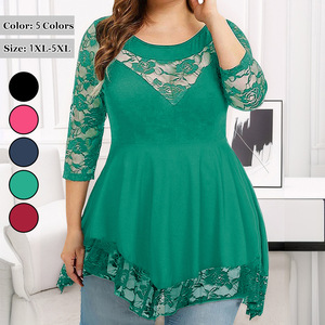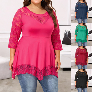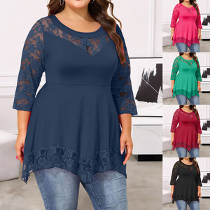 跨境欧美女装大码蕾丝拼接不规则下摆圆领上衣