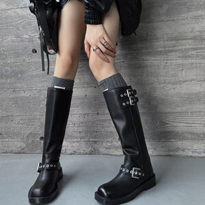 暗黑摇滚~ 朋克帅气皮带扣高筒骑士靴女方头粗跟中筒靴机车靴