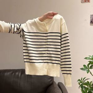 2025秋季新款女装条纹圆领长袖针织衫开衫宽松上衣打底衫毛衣薄款