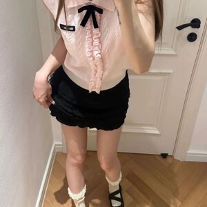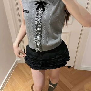 2025夏季新款法式学院风木耳边蝴蝶结针织背心女简约翻领背心上衣