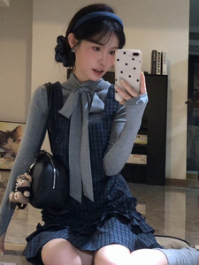 灰色上衣+格子背心裙 【秋冬装搭配一整套/气质感/冬季穿搭/绝美小套装/两件套气质韩版/时尚洋气时髦