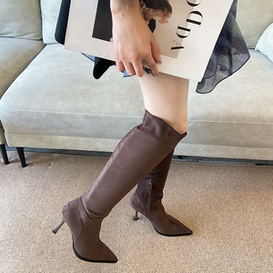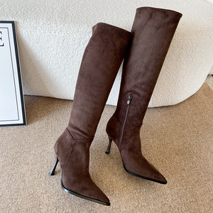 高跟绒面瘦瘦过膝长靴女鞋2025新款秋冬季卡其色堆堆长筒骑士靴子