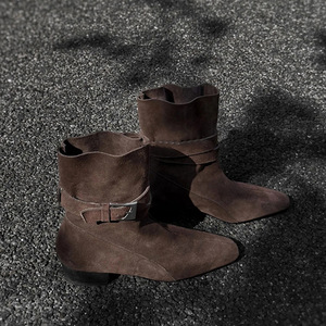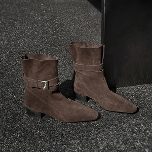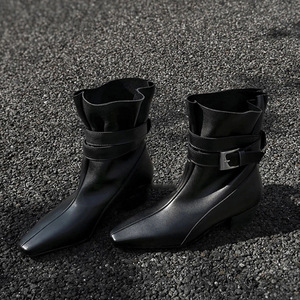 牛皮版~秋冬新款复古褶皱方头时装靴女套筒百搭皮带扣粗跟短靴女