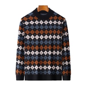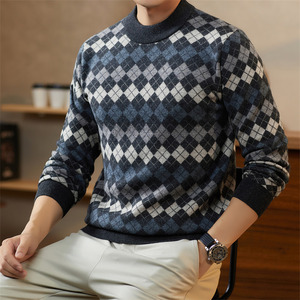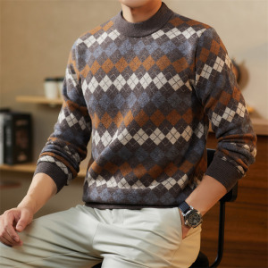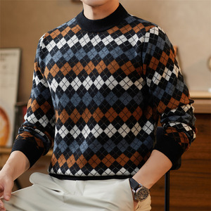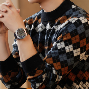 秋冬100%羊毛衫男士圆领重磅加厚格子提花时尚青年针织衫男打底衫