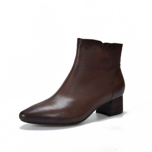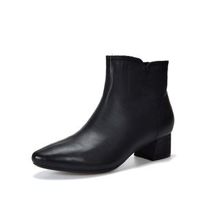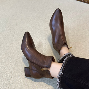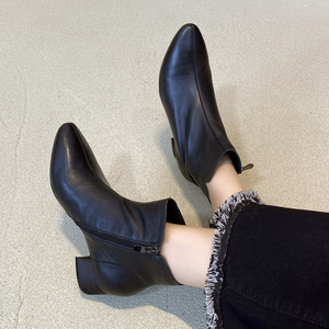 头层牛皮素面简约中跟瘦瘦靴真皮侧拉链尖头粗跟短靴2025秋冬新款