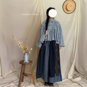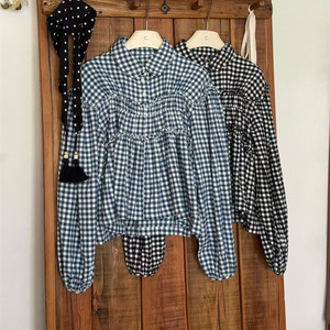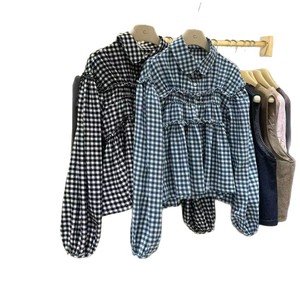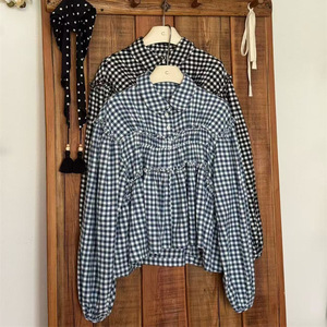 2025秋季新款法式松弛风琴褶灯笼袖纯棉格子简约衬衫女