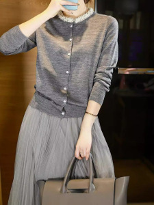 哥家商场同款女装2025秋季新款优雅气质灰色钉珠圆领长袖针织开衫