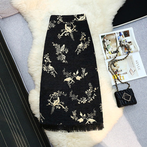 雀鸟织金提花雪尼尔复古刺绣半身裙女秋冬开叉流苏中长款A字裙