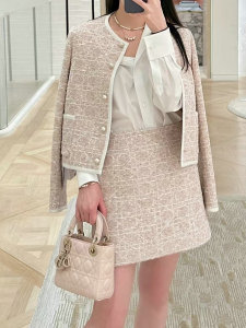 2025早秋时髦新品粗花呢格纹开衫小外套吊带裙高腰半裙时尚套装女