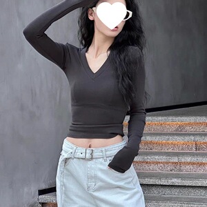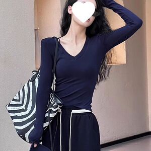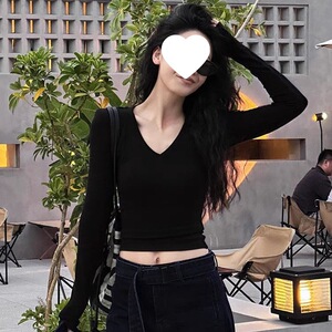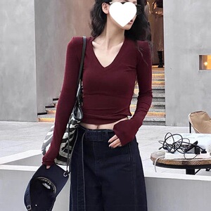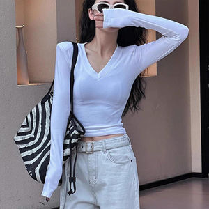 纯色短款V领长袖T恤打底衫女2025新款春秋内搭修身显瘦上衣