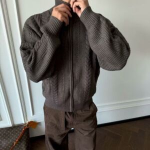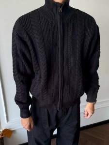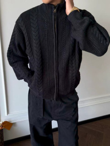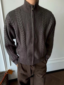 杏色提花麦穗纹开衫毛衣男款秋冬复古休闲上衣宽松立领针织衫外套