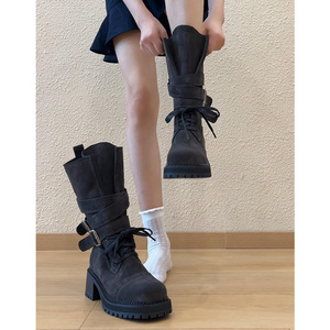 牛皮版~英伦风皮带扣粗跟骑士靴女时尚辣妹风系带中筒机车靴