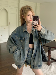 大码女装胖mm复古做旧牛仔外套女宽松休闲长袖夹克上衣