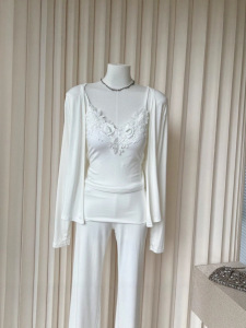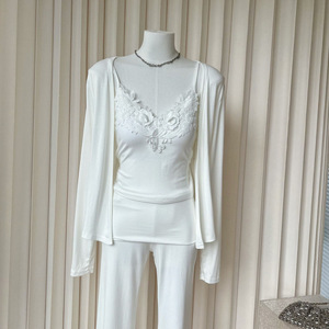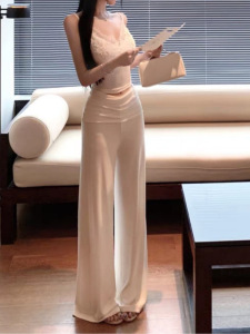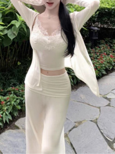 秋上新!白色无扣开衫蕾丝花边吊带阔腿针织裤套装