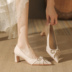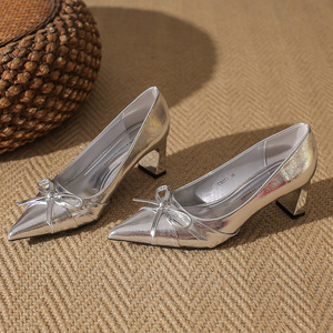 C6001时尚秀气粗跟尖头2025新款蝴蝶结高级感绸漆皮女式中跟单鞋