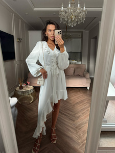 2025秋季气质法式荷叶边雪纺连衣裙女设计感不对称收腰长袖A字裙