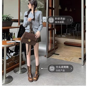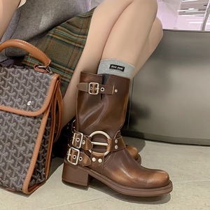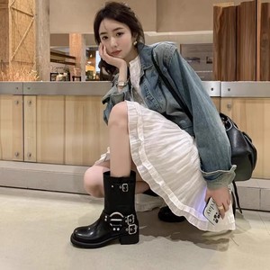 新款短靴女春秋复古西部牛仔靴子女长筒靴皮带扣马丁靴套筒骑士靴