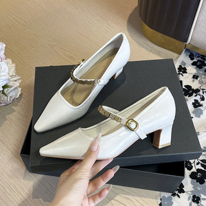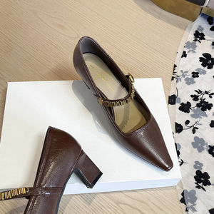 5168-21 法式复古链条一字带百搭方头气质高跟鞋女粗跟单鞋春秋