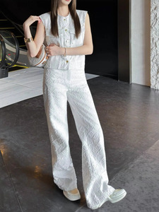 深圳南油马户家提花满印白色牛仔裤女春秋时尚休闲百搭高腰阔腿裤