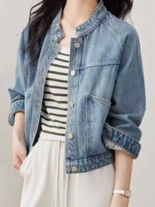 2025春秋新款复古水洗牛仔短外套女时尚立领直筒长袖小个子上衣女