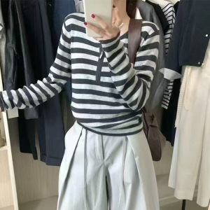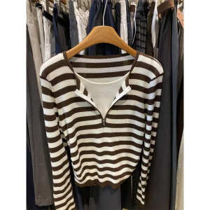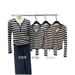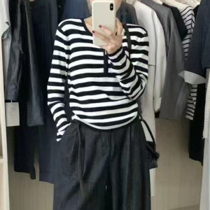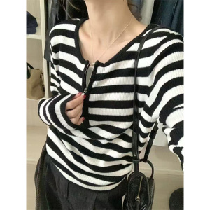 十三行秋季上衣女韩系内搭半开领长袖黑白条纹独特超好看T恤正肩