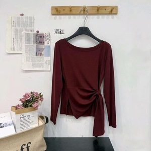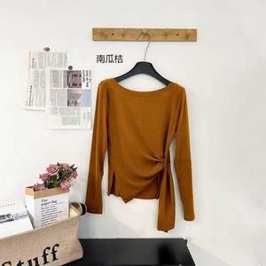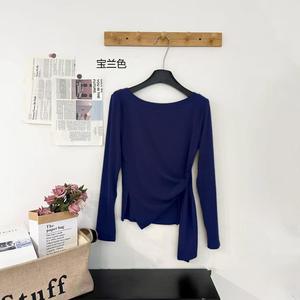 早秋设计感绑带收腰百搭显瘦长袖纯色T恤上衣不规则现货慵懒风