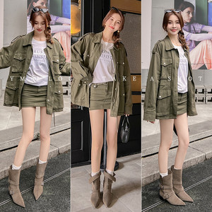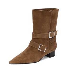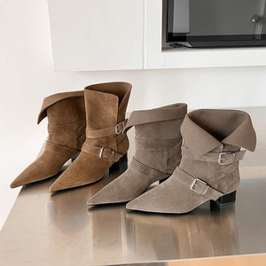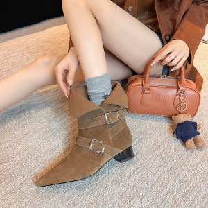 高丝光牛皮马丁靴女皮带扣宽筒靴子秋冬新款真皮尖头粗中跟女短靴