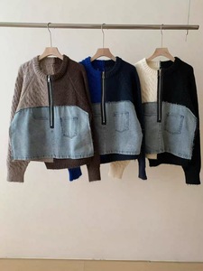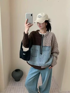 2025秋冬新款韩版牛仔拼接针织毛衣女原创设计感短款小众显瘦上衣