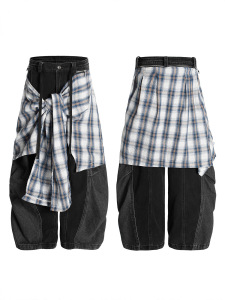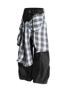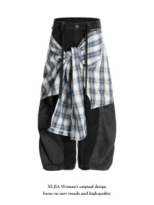 美式复古衬衫拼接假两件牛仔弯刀裤男女宽松直筒阔腿拖地长裤子