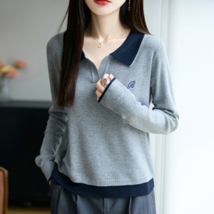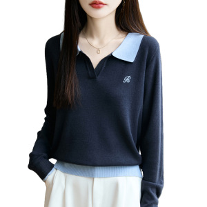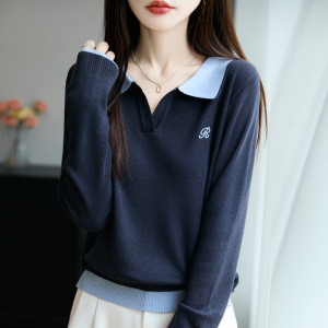 精纺羊毛2025秋冬新款女士宽松复古拼色POLO领字母刺绣长袖针织衫
