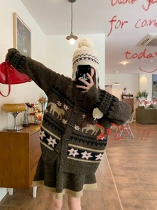 复古费尔岛毛衣套装牛角扣提花针织开衫外套半身裙女秋冬季两件套