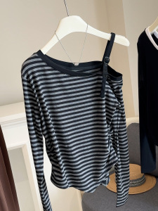 韩系斜肩设计感不规则长袖t恤女2025新款秋季时尚洋气高级感上衣