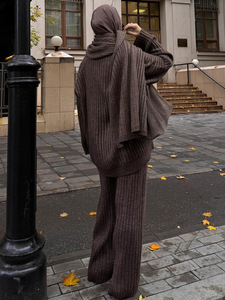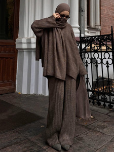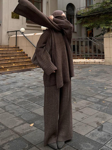 秋冬休闲坑条宽松毛衣两件套半高领长袖套头上衣阔腿直筒长裤时尚