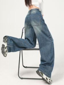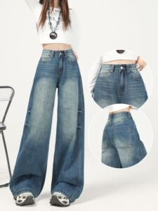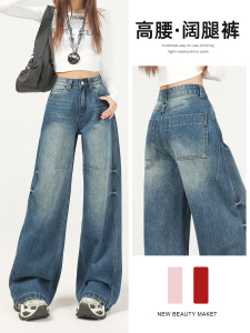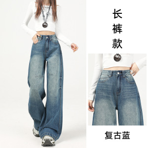 美式复古蓝阔腿牛仔裤女秋季2025年新款高腰宽松垂感拖地直筒裤子