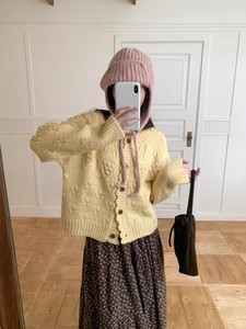蓝色花边钩花纹针织开衫外套女秋冬新款宽松韩系慵懒毛衣长袖上衣