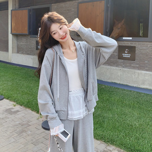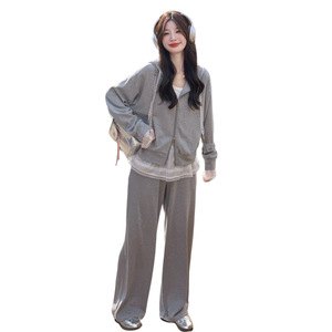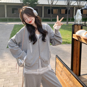 灰色韩系设计感蕾丝拼接卫衣套装女2025秋季时尚休闲阔腿裤两件套