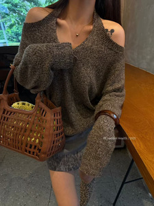 十三行正品2025秋季新款韩版洋气时尚百搭V领挂脖宽松纯色针织衫